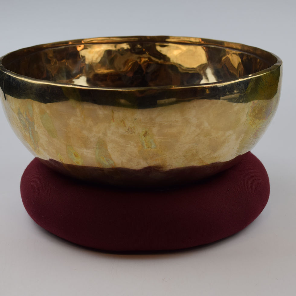 Handgefertigte Klangschale aus traditioneller Fertigung mit goldener Oberfläche und klassischer Schalenform. Der Klang ist warm, voll und langanhaltend, mit gleichmäßiger Schwingung und angenehmem Nachklang.