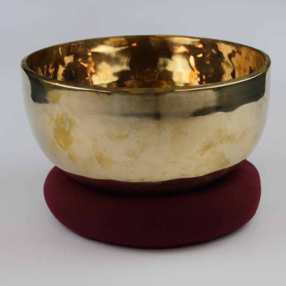 Handgefertigte Klangschale aus traditioneller Fertigung mit goldener Oberfläche und klassischer Schalenform. Der Klang ist ausgewogen, klar und angenehm tragend, mit harmonischer Schwingung und ruhigem Nachklang.